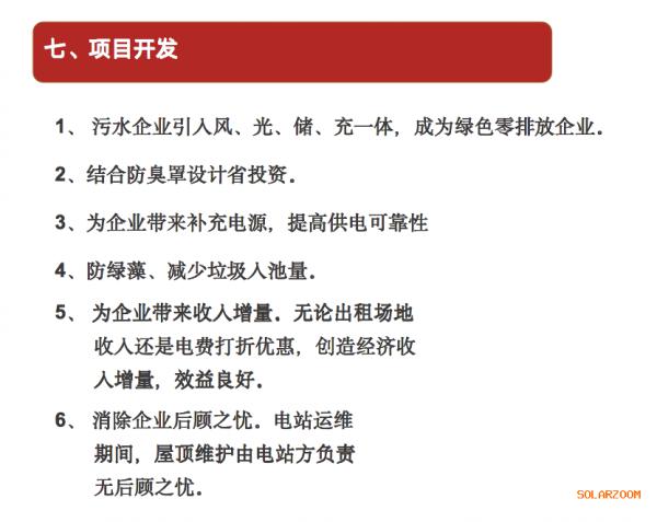 再好的设计也需要有具体的项目去实现,针对污水处理厂分布式光伏项目的开发理念,中机国能浙江工程有限公司认为,“污水厂一般都是国企,我们可以引入风、光、储、充一体,成为绿色零排放企业,他们对这些方面还是很重视的。光伏电站结合防臭罩设计节省投资,防绿藻、减少垃圾入池量,同时也为企业带来了补充电源,提高了通电可靠性,更重要的是,无论是租金还是电费打折都可以为企业带来增量。另外,必须跟企业强调,电站运维由电站方负责,消除企业的后顾之忧。”