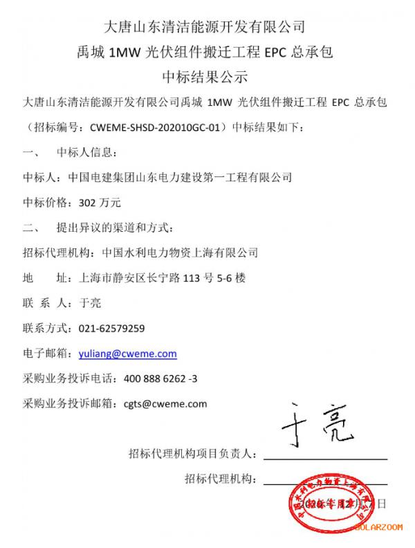大唐禹城1MW光伏组件搬迁工程EPC总承包中标结果公示