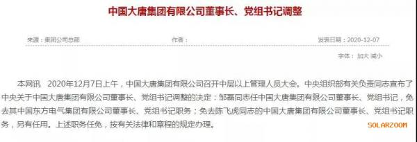 2020年12月7日上午,中国大唐集团有限公司召开中层以上管理人员大会。中央组织部有关负责同志宣布了中央关于中国大唐集团有限公司董事长、党组书记调整的决定:邹磊同志任中国大唐集团有限公司董事长、党组书记,免去其中国东方电气集团有限公司董事长、党组书记职务;免去陈飞虎同志的中国大唐集团有限公司董事长、党组书记职务,另有任用。上述职务任免,按有关法律和章程的规定办理。