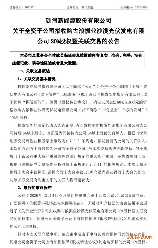 珈伟新能(300317)晚间公告称,公司全资子公司珈伟(上海)光伏电力有限公司拟于近日与振发新能集团有限公司签署《股权转让协议》,确定以现金2804.52万元的价格,收购古浪振业沙漠光伏发电有限公司20%的股权。