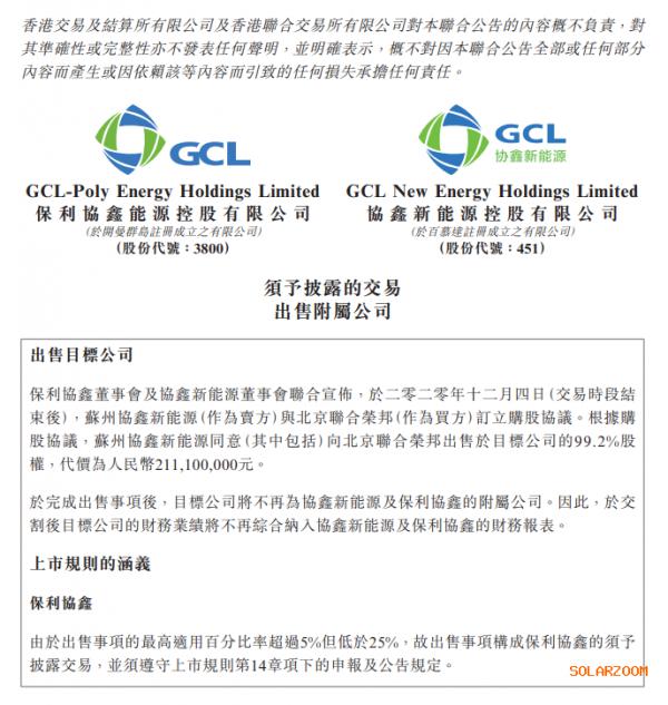 12月4日,协鑫新能源(0451.HK)发布公告称,公司间接附属公司苏州协鑫新能源与北京联合荣邦新能源科技有限公司签订光伏电站购股协议,出售1座总并网容量约50兆瓦的已营运光伏电站的99.2%股权。