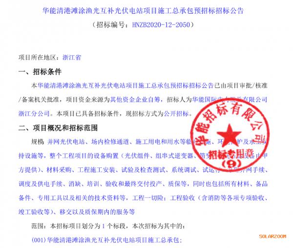 12月5日,华能清港滩涂渔光互补光伏电站项目施工总承包预招标招标公告发布。