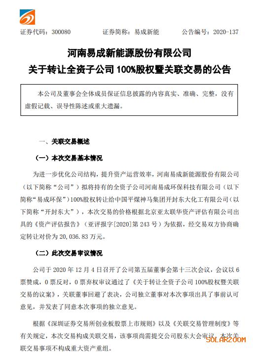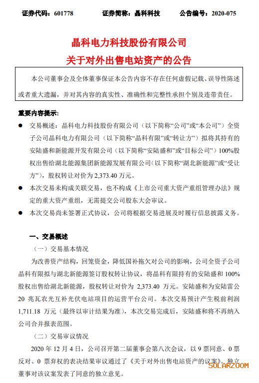 12月4日晶科科技宣布,为改善资产结构,回笼资金,降低国补拖欠对公司的影响,公司全资子公司晶科有限拟与湖北新能源签订股权转让协议,将晶科有限持有的安陆盛和100%股权出售给湖北新能源,股权转让对价为2373.40万元。安陆盛和为安陆雷公20兆瓦农光互补光伏电站项目的运营平台公司。