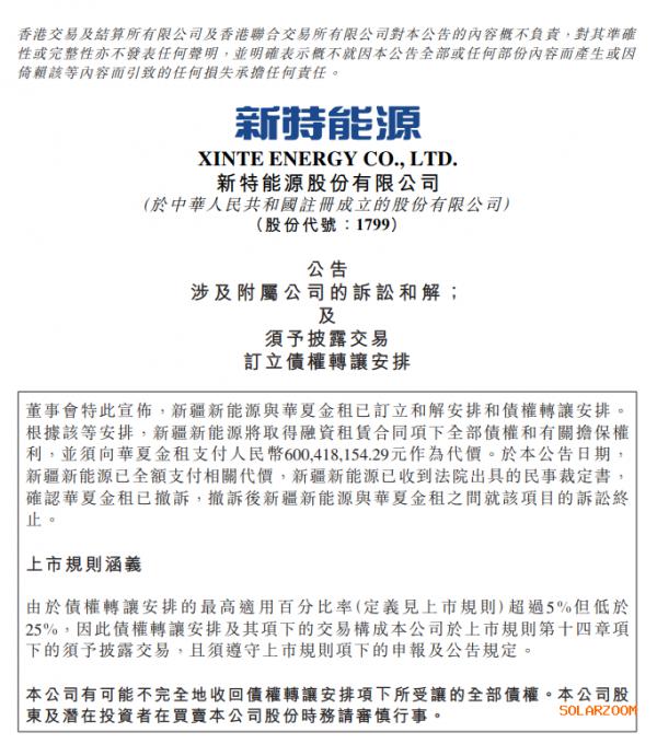 新特能源(01799)公布,该公司附属新疆新能源与华夏金租已订立和解安排和债权转让安排。根据该等安排,新疆新能源将取得融资租赁合同项下全部债权和有关担保权利,并须向华夏金租支付约人民币6亿元作为代价。