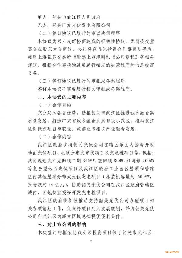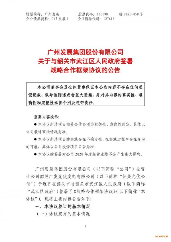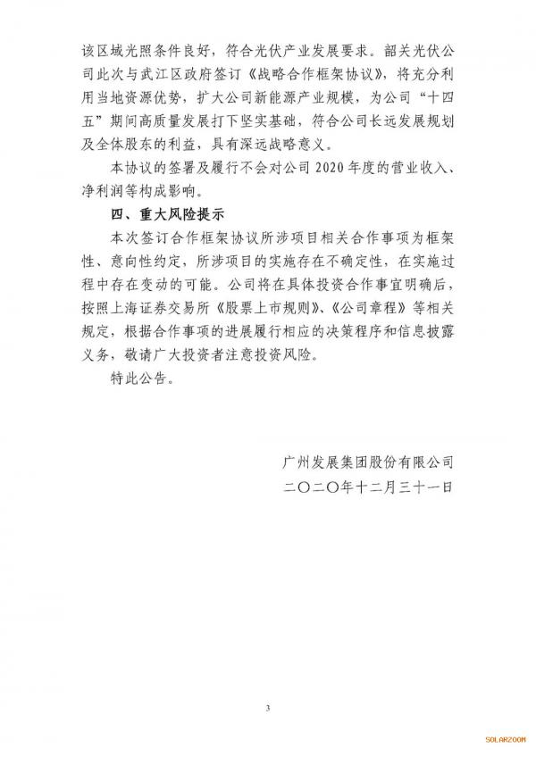 12月30日,广州发展发布公告称,全资子公司韶关广发光伏发电有限公司与韶关市武江区人民政府(“武江区政府”)签署了《战略合作框架协议》。