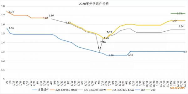 年初组件厂开工率较低且物流受阻,三月份组件工厂逐渐开工,但海外疫情加重导致组件需求转弱、出口受阻,出现订单延迟甚至退单的情况。4月份光伏组件价格开始下探,多晶组件在7月底降至1.26元/W,单晶325-335/395-405W在7月初降至1.3元/W,单晶355-365/425-435W在7月底降至1.45元/W。