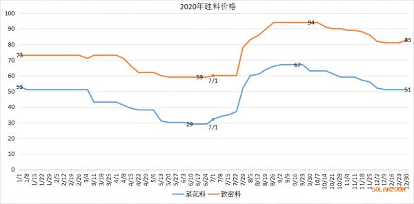 2020年菜花料价格在29~67元/kg之间,致密料价格在59~94元/kg之间。1-2月份硅料价格平稳,主要原因系春节备货以及年初疫情导致企业开工率较低、需求疲软;3月份疫情逐渐缓解,且伴随630小规模并网抢装的开始,国内市场需求回暖,硅料价格开始稳步下跌,6月份硅料价格来到了全年最低点。
