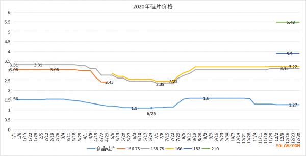 与硅料相比,2020年硅片价格较为平稳,相关企业自觉“消化”掉一部分涨跌幅。据统计,G1硅片价格在2.38~3.31元/pcs,166硅片在2.47~3.22元/pcs,182硅片为3.9元/pcs,210硅片为5.48元/pcs,多晶硅片价格在1.1~1.6元/pcs。