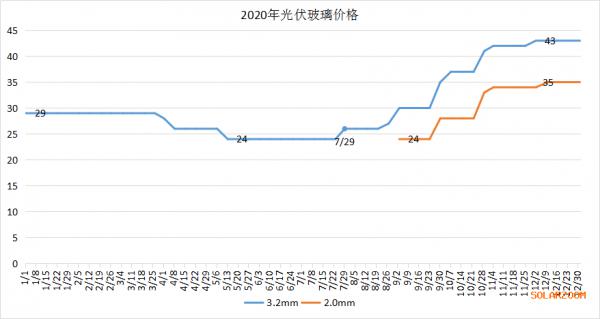 双玻、大尺寸组件的需求加大是导致光伏玻璃上涨的直接原因,而电池组件扩产速度和光伏玻璃投产进度不匹配也是导致玻璃价格上涨的又一重要原因,目前2.0mm、3.2mm光伏玻璃平均价格仍处在35、43元/㎡的高位。