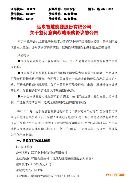 远东股份公告,公司全资孙公司江西远东电池与江苏小牛电动科技有限公司签署了《意向战略采购协议》,2021至2023年,小牛电动将向江西远东电池采购不低于1.5亿支的18650三元锂电芯,预计产生营业收入不低于9亿元。公司表示,本合作协议的签署是锂电行业对公司智能电池业务的认可,协议履行期为3年,预计不会对公司经营业绩产生重大影响。