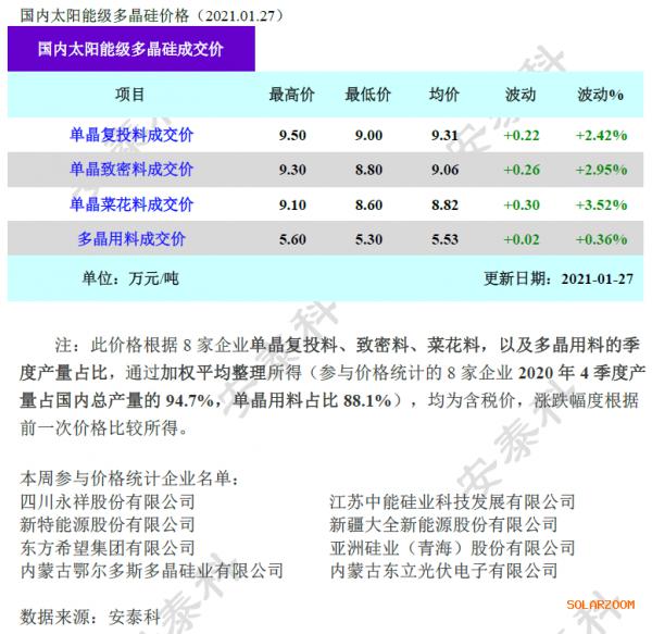 本周多数硅料企业2月份订单已签订完毕,甚至有部分企业新签3月份订单,且成交价延续上涨走势,主要原因包括:第一,硅片产能扩张如期释放,实际需求增加,且需求增幅大于硅料供应增量;第二,惯例春节前囤货本就会刺激部分预需求,加之目前正值硅片产能增量释放的阶段,春节期间需要的备货量也随之增加,同时疫情对本年度春节前物流影响也大于往年,从1月底开始物流运输陆续受阻,因此本周下游签单积极性更加高涨。
