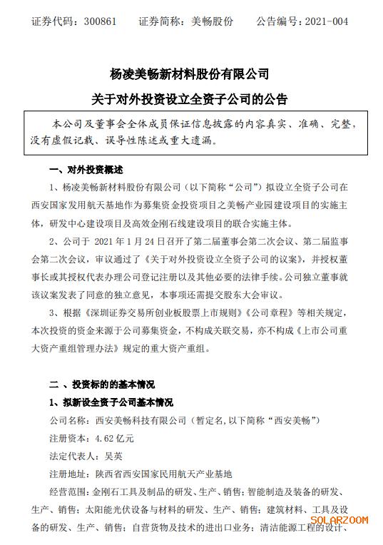 1月25日,美畅股份发布公告称,公司拟以募集资金出资4.62亿元设立西安美畅科技有限公司(暂定名,以下简称“西安美畅”)。根据公告,新公司成立后,美畅股份将以新设的西安美畅为实施主体,建设募集资金投资项目“美畅产业园建设项目”,同时,还将与公司的另一全资子公司杨凌美畅科技有限公司一同联合实施募集资金投资项目“高效金刚石线建设项目”。