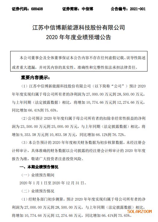 中信博1月26日晚间发布业绩预告,预计2020年年度实现归属于母公司所有者的净利润为2.70亿元到2.85亿元,与上年同期相比,将增加约1.08亿元到约1.23亿元,同比增加66.41%到75.65%。