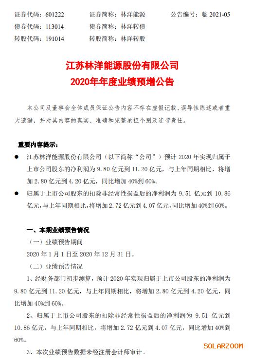 林洋能源发布业绩预告。公司预计2020年实现归属于上市公司股东的净利润为9.80亿元到11.20亿元,与上年同期相比,将增加2.80亿元到4.20亿元,同比增加40%到60%。