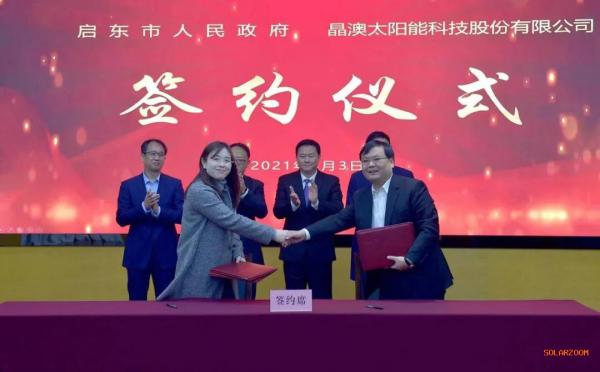 3月3日,晶澳科技与江苏省启东市人民政府签订战略投资框架协议,晶澳科技将在启东市投资建设20GW光伏电池、组件及配套光伏装备项目。启东市委副书记、市长杨中坚,晶澳科技董事、执行总裁牛新伟博士等领导出席签约仪式。