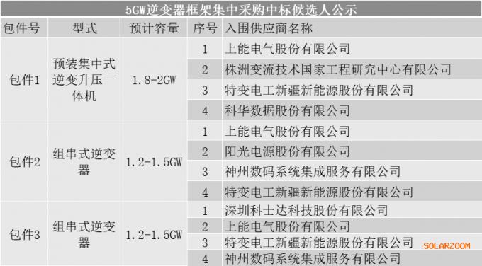逆变器方面,此次招标同样为5GW,分为3个包件,主要中标候选人为阳光电源,特变电工,上能电气和华为(代理商为神州数码),每个包件最终将确定3名入围供应商。