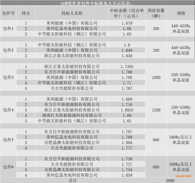 组件方面,本次中核汇能光伏组件框架采购共分6个包件,预估总招标容量5GW。中标候选名单为英利能源、晶澳科技、东方日升、天合光能、正泰新能源以及亿晶光电等多家组件厂商。