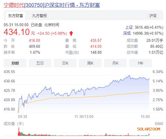 截至5月31日收盘,宁德时代股价报434.10元,成交20.01万手,成交额85.40亿元,总市值101123亿元,成为了创业板首只万亿个股。
