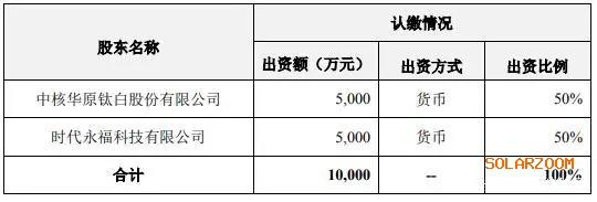 新公司中核时代注册资本1亿元,其中中核钛白和时代永福分别认缴出资5000万元,各持中核时代50%股份。新公司拟从事光伏、风电等综合智慧能源的投资、建设、运营,并拟在甘肃省投资运营集中式大型地面光伏电站、分布式屋顶光伏电站、陆地风电等项目。投资双方在甘肃省投资、建设、运营的其他新能源项目,在双方一致认可的前提下,优先由合资公司来实施。