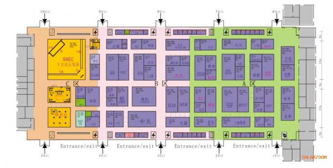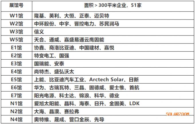 6月3日-5日,第十五届(2020)SNEC国际太阳能光伏与智慧能源论坛即将在上海举办。本次展会一共17个展馆,其中各展馆里面积300平米及以上的企业共51家,如下表所示。