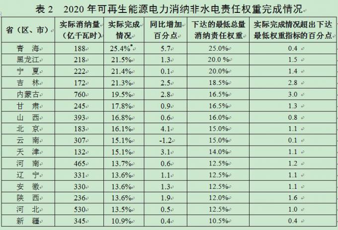 备注:1.青海省加上了河南省转让的12亿千瓦时超额消纳量;