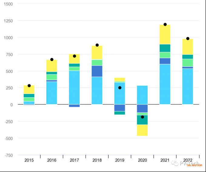2015-2022年全球电力需求的变化,以TWh为单位。浅蓝色:中国,深蓝色:美国,浅绿色:印度,深绿色:欧洲,黄色:其他,黑点代表净变化。