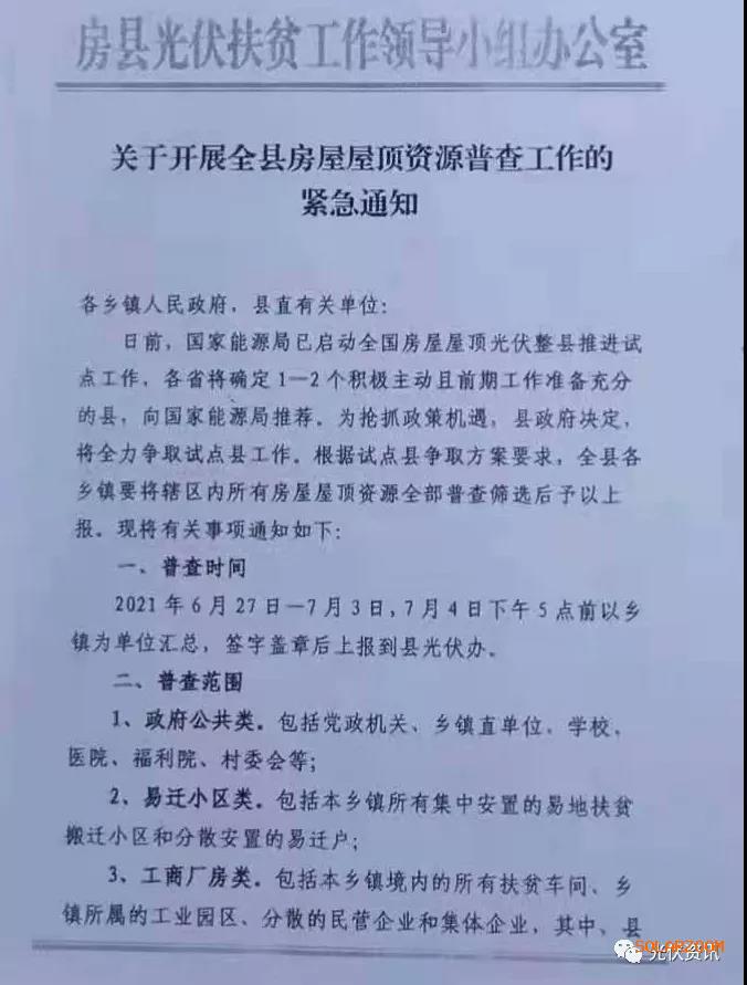 近日记者了解到,房县下发关于开展全县房屋屋顶资源普查工作的紧急通知,各省将确定1-2个积极主动且前期工作准备充分的县,向国家能源局推荐,全县各乡镇要将辖区内所有房屋屋顶资源全部普查筛选后予以上报。普查范围包括政府公共类,易迁小区类,工商厂房类,农户自建房类。
