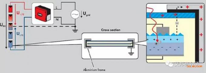 由于防雷工程的需要,组件的铝合金边框要求接地,电池片与铝边框之间便形成了比较高的直流电压。对EVA封装组件来说,EVA无法做到100%的绝缘,使用过程中,水气透过硅胶、背板等渗透到组件内部,使EVA发生分解,产生自由移动的醋酸,醋酸和玻璃表面析出的碱反应,形成自由移动的钠离子,钠离子在外加电场的作用下,向电池表面移动,聚集到电池表面的减反射层从而导致组件功率降低。
