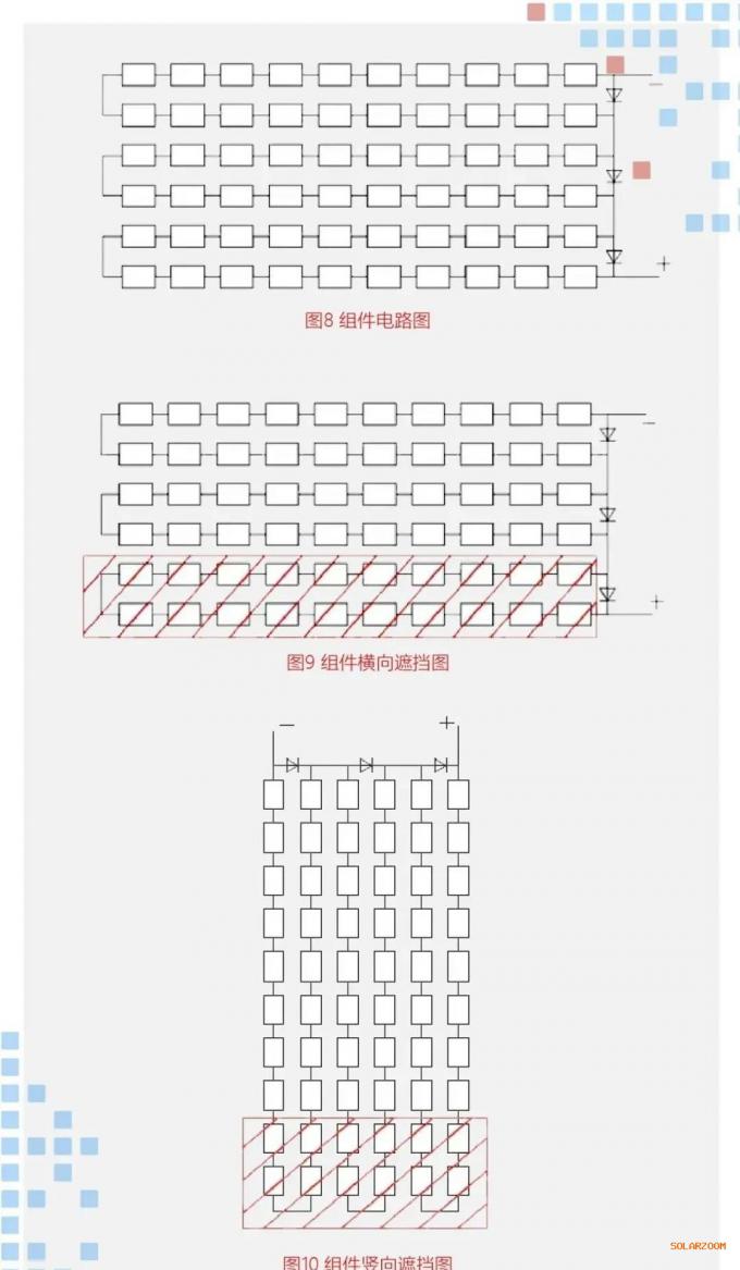 图10遮挡一块组件最下边两排电池片,竖向排布时,组件中的每一路均有电池片被遮挡,电路断路,3排电池片均无功率输出。