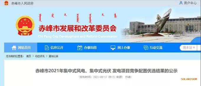 9月17日,赤峰市发改委发布赤峰市2021年集中式风电、集中式光伏发电项目竞争配置优选结果的公示,公示显示: