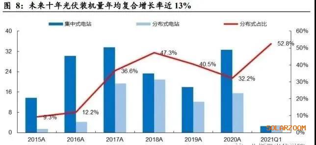 平价时代来临,光伏开启快速成长。光伏电价在越来越多的国家和地区已经低于火电电价,成为最具竞争力的电力产品。2021年4月,位于沙特的光伏项目最低电价达到了再创世界纪录的1.04美分/kWh,折合人民币价格约0.067元/kWh,光伏平价已在越来越多的地区成为可能。根据我们对未来十年光伏装机量测算,预计光伏新增装机量年均复合增长率有望达13%左右。