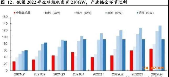 行业迎大扩产,产能全面过剩下有望助力需求激增。测算2022年各环节产能配比,均远大于210GW,产业链各环节大概率面临全面过剩。产能过剩下,往往带来产业链价格大幅下降,低价有望进一步刺激需求快速增长。2022年行业价格降价背景下,有望带来下游需求量爆发式增长。