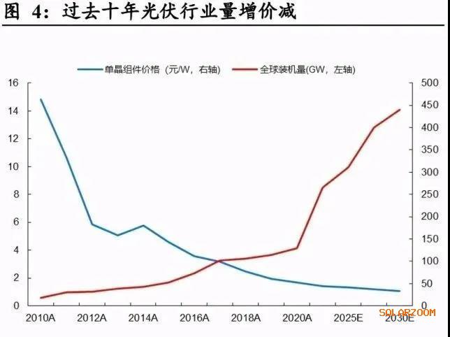 根据我们做的测算,假设在2030年,工业硅、硅料、硅片、电池、组件,单个环节的毛利率分别为:25%、25%、20%、12%、8%,并根据各项技术未来降本路径,进行成本推算,测算对应到2030年组件价格,对应在含税价格1.08元/W,未来10组件价格在现有技术优化下,年均成本及价格降幅在4%左右,但组件量增在13%左右,未来十年光伏行业将迈入稳增长阶段。