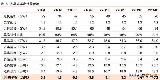 硅料供需紧平衡格局或延续至2022年。基于我们对于2021/22年全球光伏新增装机预期160/210GW,以及1:1.2的容配比及存货比例,预计全球新增光伏装机对应的组件需求为192/252GW,对应组件生产对应的硅料需求量约56/71万吨。相较2021H2硅料供不应求的情况,2022H1行业供需紧张情况有望逐步趋缓,但考虑到在其直接下游硅片环节集中扩产的情况下,新硅片产能采购开工的硬性需求,或放大硅料供需紧张程度,供给或仍然偏紧。