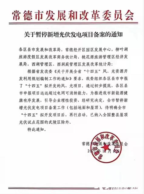 11月3日,常德市发改委发布关于暂停新增光伏发电项目备案的通知。