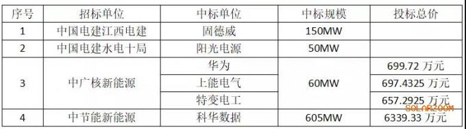 据了解,固德威技术股份有限公司中标中国电建江西电建公司赞皇150MW农光互补光伏项目逆变器及附属设备采购项目;阳光电源股份有限公司中标中国电建水电十局青海格尔木港青新能源乌图美仁50MW光伏项目逆变器及附属设备采购项目。