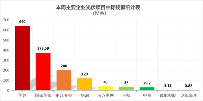 据统计,本周国家能源、中国能建、华润、三峡等企业发布了19个中标项目,中标规模达1443.72MW。相较上周中项目数量大幅下降。本周中标项目集中在中国能建、国家能源、浙江交投以及华润等四家。其中中国能建640.MW,国家能源集团373.59MW,华能浙江交投200MW。