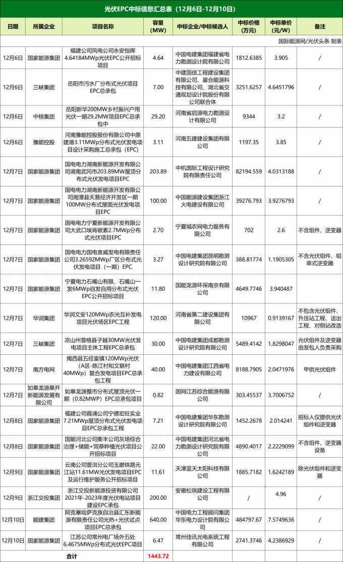 1443.72MW中标项目,大EPC均价持续走低至3.94元/瓦