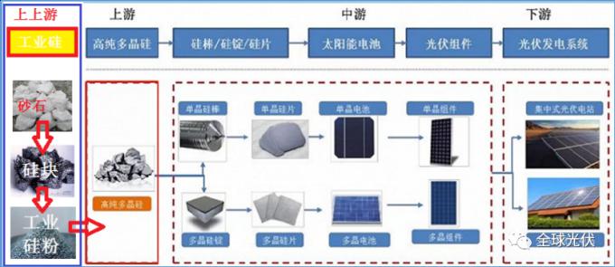 而真正最全的晶硅光伏产业链,是从砂子到光伏发电。把富含二氧化硅的砂子(含量高的才叫硅石)通过焦炭氧化还原,二氧化硅变成了黑色的金属硅,为了进一步加工,金属硅还要变成细细的硅粉,送到多晶硅厂氯化,再还原成高纯多晶硅。高纯多晶硅开始,才进入纯粹的光伏产业链,如下图所示: