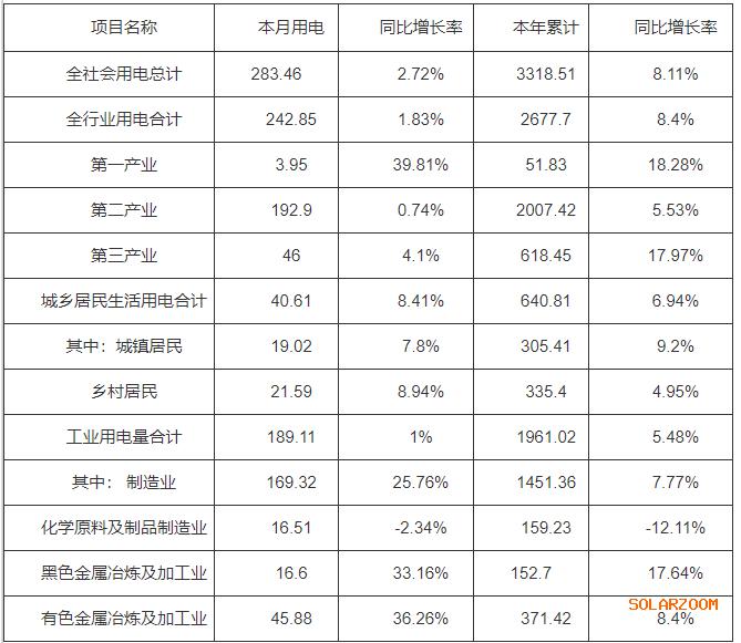 (一)全社会用电量情况。全省全社会用电量283.46亿千瓦时,同比增加2.72%;累计用电量3318.51亿千瓦时,同比增加8.11%。