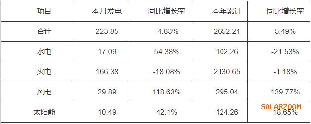 (一)发电量情况。11月份当月,全省发电量223.85亿千瓦时,同比减少4.83%。其中水电17.09亿千瓦时,同比增长54.38%;火电166.38亿千瓦时,同比减少18.08%;风电29.89亿千瓦时,同比增长118.63%;太阳能10.49亿千瓦时,同比增长42.1%。
