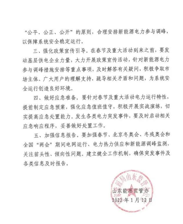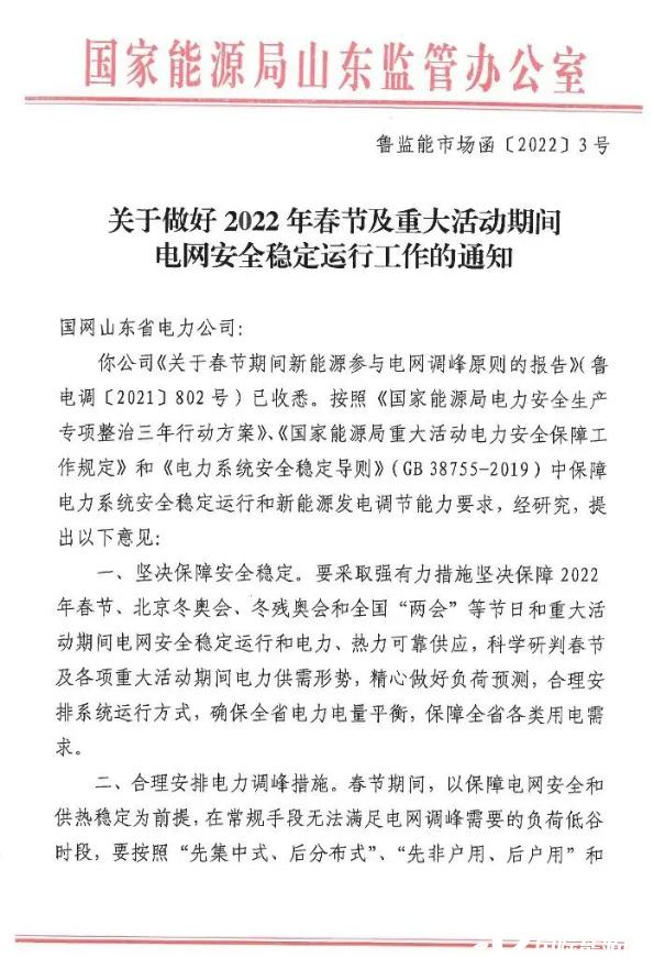 2022年1月22日,国家能源局山东监管办公室发布《关于做好2022年春节及重大活动期间电网安全稳定运行工作的通知》,提出: