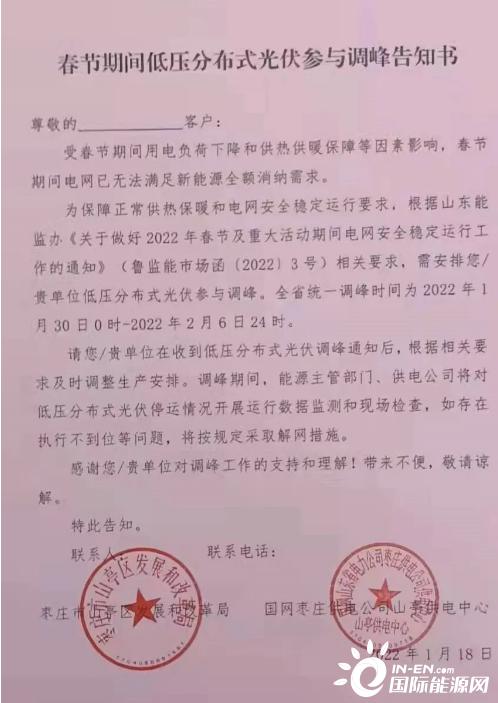 随后,各地级市也根据精神,下发了《春节期间低压分布式光伏参与调峰告知书》。