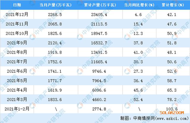 2021年12月全国太阳能电池产量为2268.5万千瓦,同比增长4.6%,同比增长率下降。2021年全国太阳能电池产量为23405.4万千瓦,同比增长42.1%,产量持续增长。
