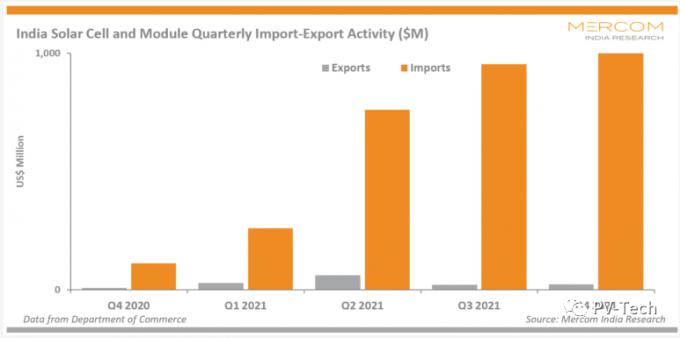 2021年四季度,中国是印度最大的太阳能产品出口国,市场份额为89.5%。美国仍然是印度太阳能组件的主要进口国,市场份额为39.6%。