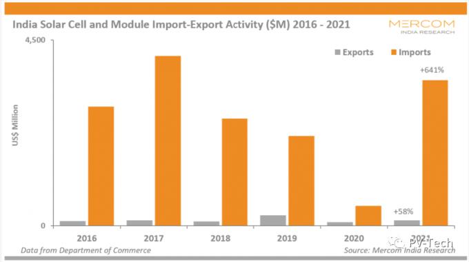 2021年,印度进口的太阳能电池和组件价值35.2亿美元(约合2626亿印度卢比),与2020年相比,增长了641%。2020年,印度太阳能行业进口了价值近4.7578亿美元(约合346.5亿印度卢比)的太阳能组件和电池。