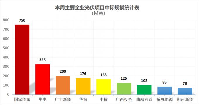 本周国家能源集团、华电、华润、中核等企业发布了33个中标项目,总规模共计2089.64MW。与节前一周情况相似,本周中标项目偏少,开标项目容量较小且极为分散。其中,国家能源集团以750MW位居第一,华电以325MW位列第二,广丰新能则以200MW排名第三。