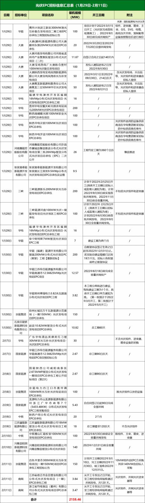 本周值得注意的是华电陕西能源有限公司相关项目2022年1月新能源项目第2组2个光伏项目总承包招标项目。该项目划分为陕西华电汉阴100MW光伏项目EPC总承包、陕西华电洋县100MW光伏项目EPC总承包2个标段。根据招标公告,光伏组件选用的设备供应商须在华电集团框采招标的中标供应商名单内。
