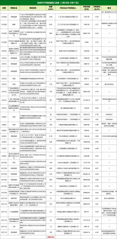 本周大EPC项目24个,中标价格落在3.15~4.78元/瓦之间,均价为4.14元/瓦。与节前相比,本周大EPC均价明显提高。