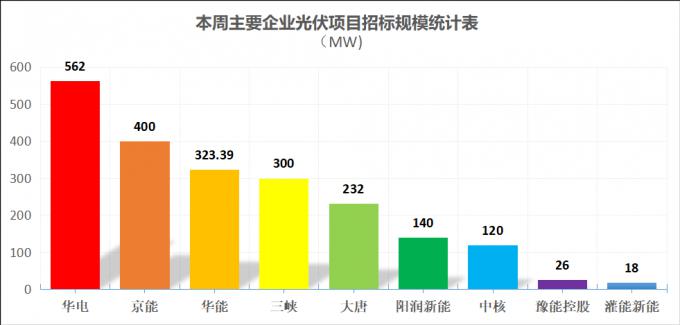 从招标规模来看,华电以562MW排名第一,京能集团400MW位列第二,华能则以323.39MW排名第三。